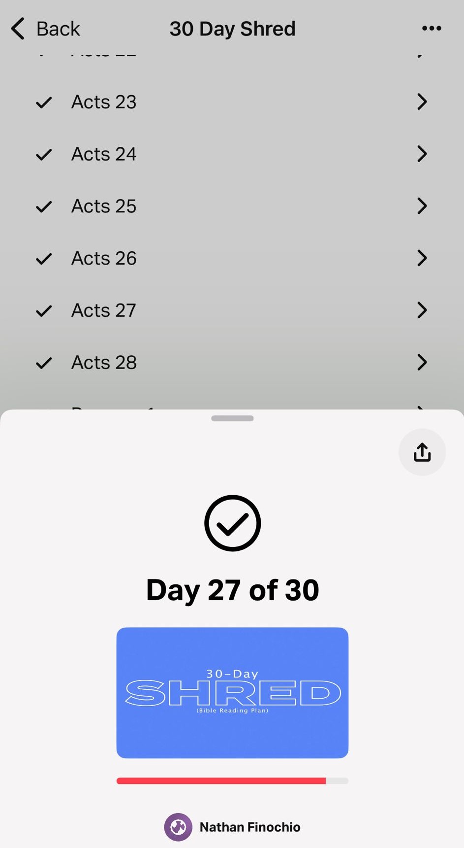 I used the 30-day Shred plan that is free from the YouVersion Bible App. You can download the app, save the plan for later or start it now. This plan easily lets you keep track of your daily reading, and you can mark off your progress in real time.